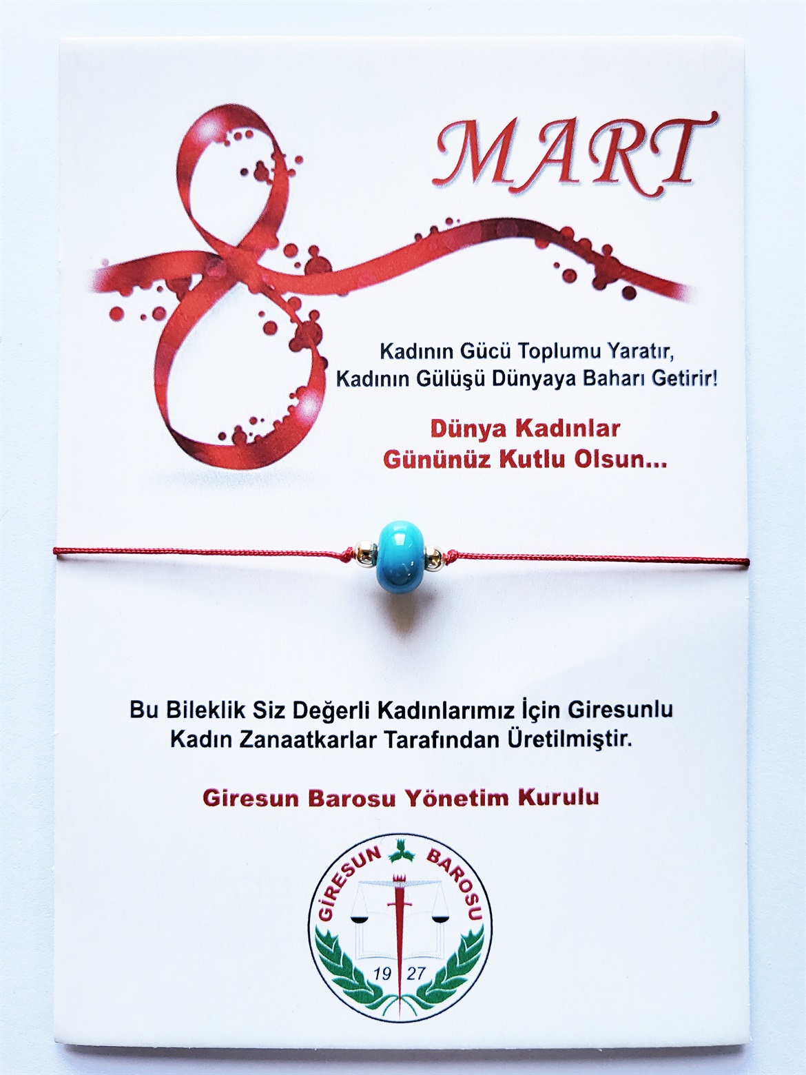 Baromuz tarafından 8 Mart Dünya Kadınlar Günü anısına, Giresunlu Kadın Zanaatkârlarımızın üretmiş olduğu bilekliklerimizi; ilçedeki meslektaşlarımız ve stajyerlerimiz için Baro İlçe Temsilcilerimiz vasıtası ile; il merkezinde bulunan meslektaşlarımız ve stajyerlerimize ise görev yaptıkları ofislerinde Baro personellerimiz ile dağıttık.