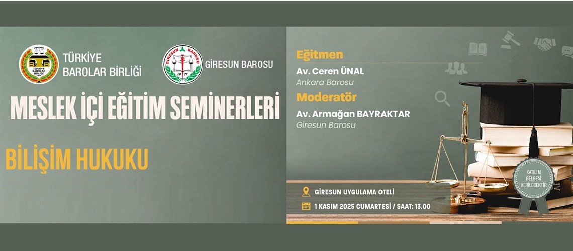 Baromuzca 01 Kasım 2025 Cumartesi günü saat 13:00'da Giresun Uygulama Otelinde Av.Ceren ÜNAL'ın sunumuyla "Bilişim Hukuku" konulu, sertifikalı ücretsiz eğitim semineri düzenlenecektir. Katılmak isteyen meslektaşlarımızın isimlerini 30 Ekim 2025 Perşembe günü mesai bitimine kadar Baro Kalemine yazdırmaları önemle duyurulur. Giresun Barosu Yönetim Kurulu