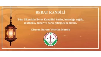 Ülkemizin Berat Kandilini kutlar, tüm insanlığa sağlık, mutluluk, huzur ve barış getirmesini dileriz. Giresun Barosu Yönetim Kurulu