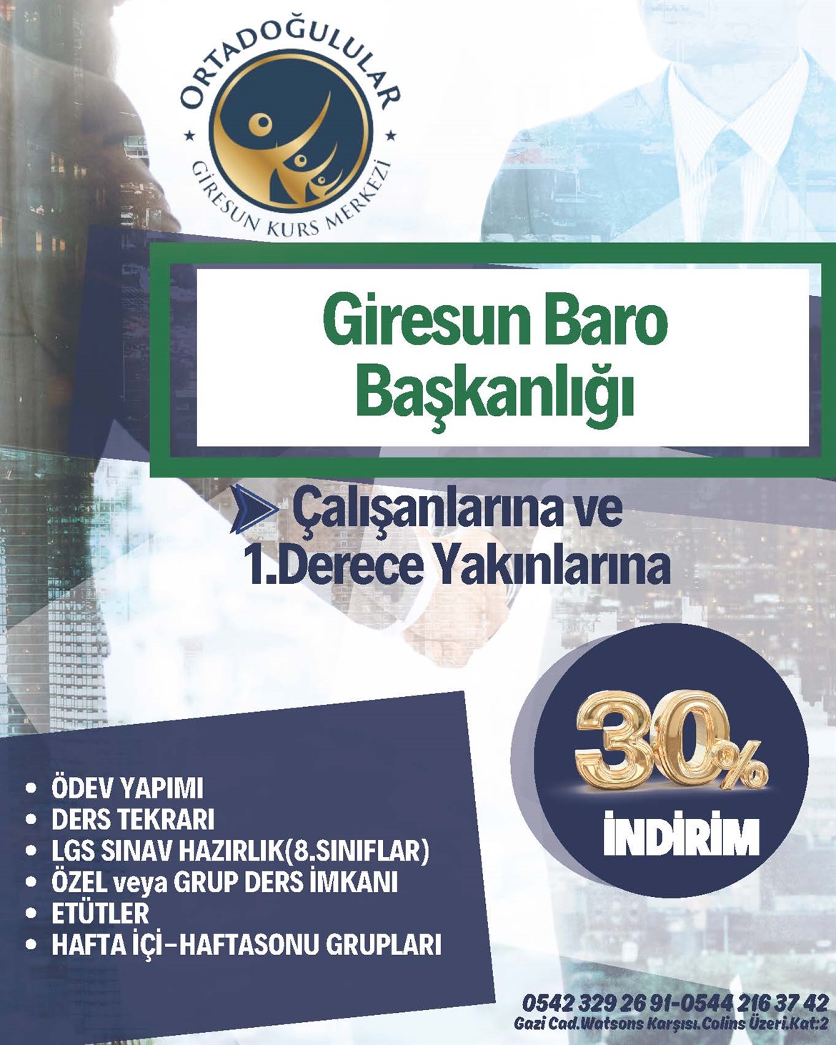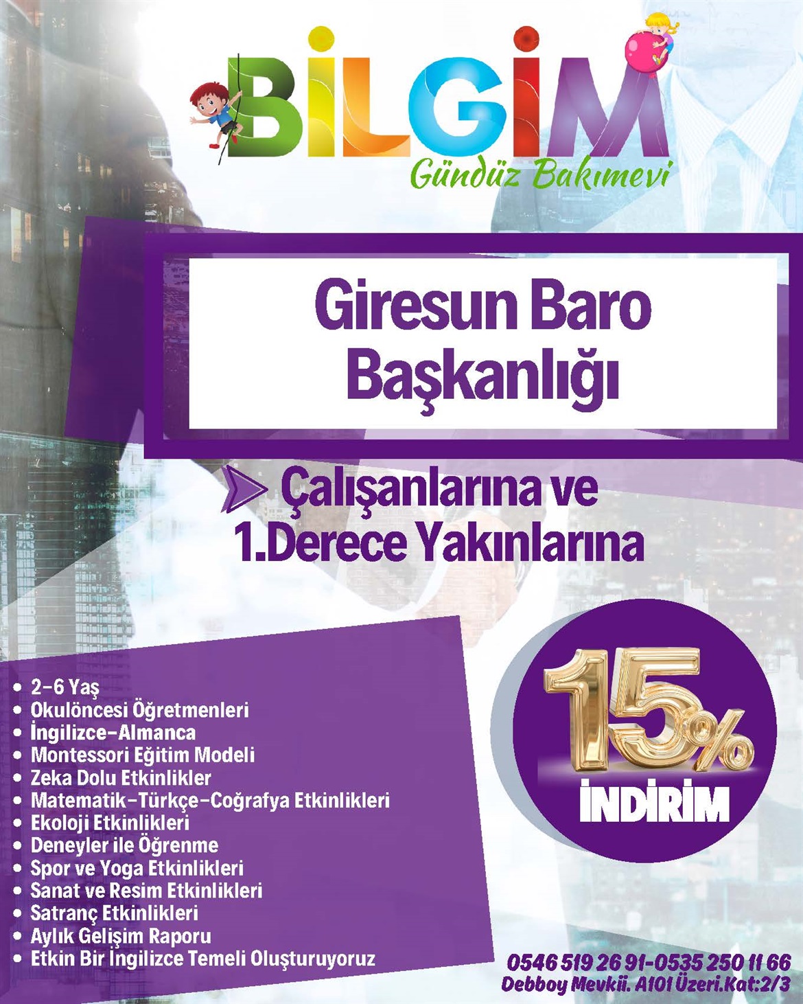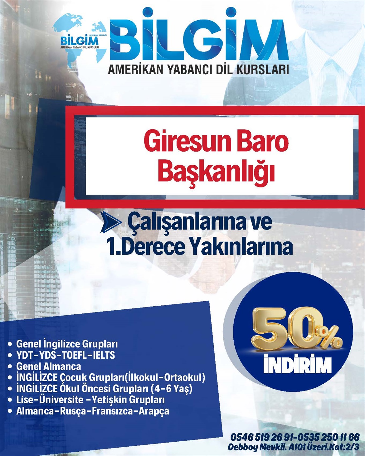 Baromuz ile Bilgim Amerikan Yabancı Dil Kursu, Ortadoğulular Giresun Kurs Merkezi ve Bilgim Gündüz Bakım Evi arasında yapılan anlaşma uyarınca meslektaşlarımız, Baro personellerimiz ve birinci derece yakınlarına özel; Bilgim Amerikan Yabancı Dil Kursunda %50, Ortadoğulular Giresun Kurs Merkezinde %30 ve Bilgim Gündüz Bakım Evinde %15 oranında indirim yapıldı.