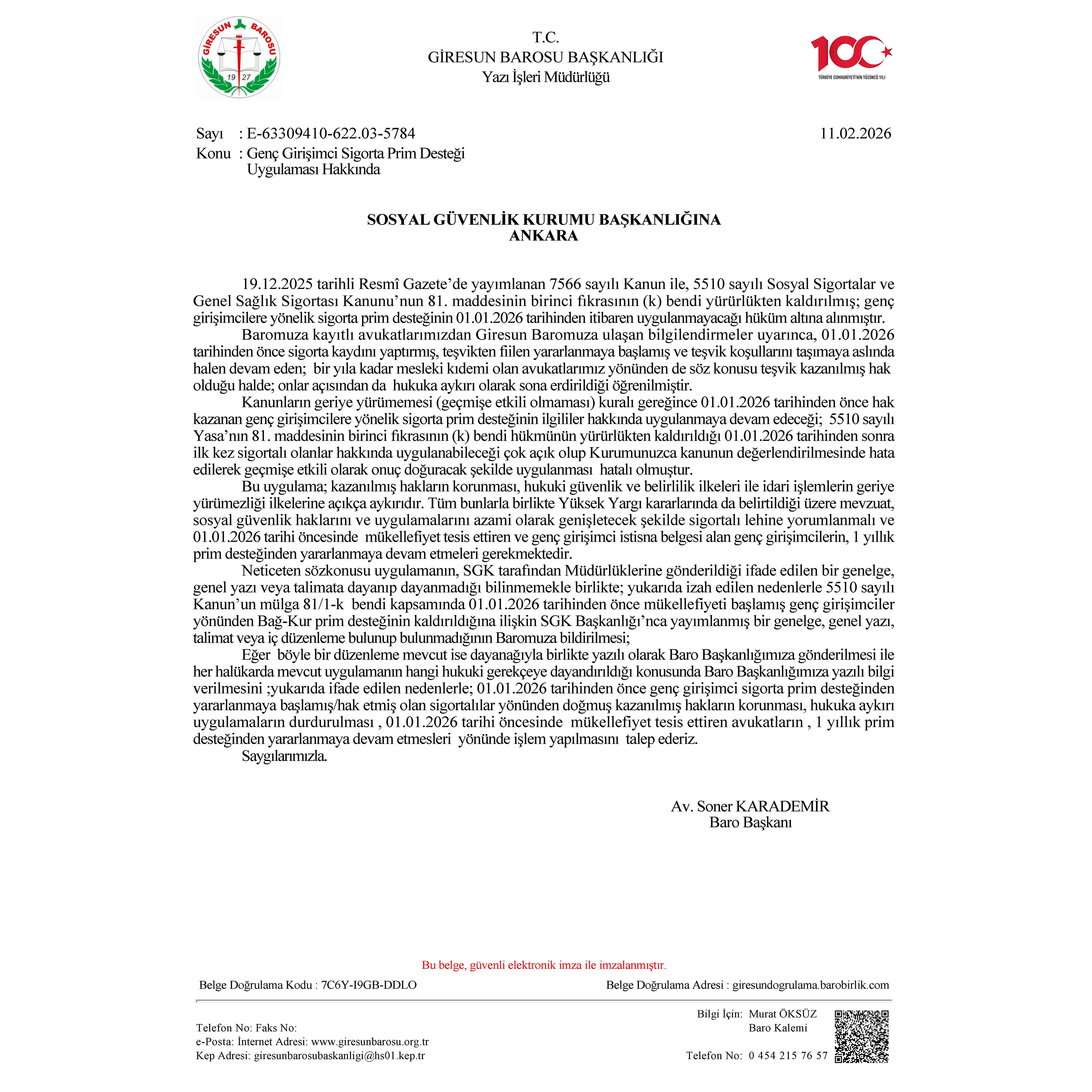 Genç meslektaşlarımız için mesleğin ilk yılında uygulanan prim muafiyetinin 2026’dan itibaren kaldırılmasına ilişkin karara karşı kazanılmış hakların korunması ve hukuka aykırı uygulamaların sona erdirilmesi amacıyla Baromuzca Sosyal Güvenlik Kurumu Başkanlığı’na talepte bulunulmuştur