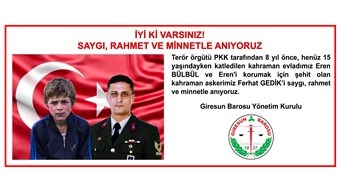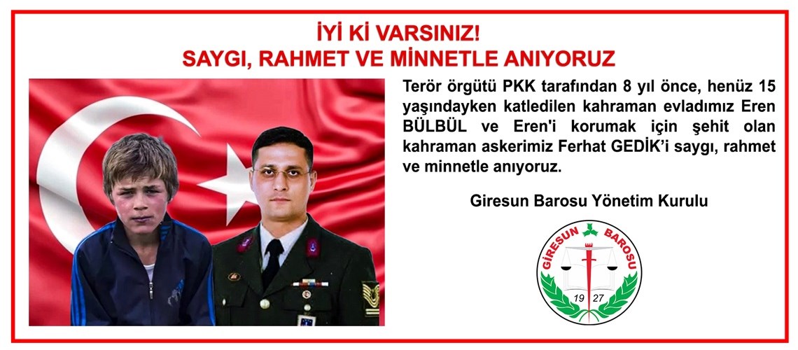 Terör örgütü PKK tarafından 8 yıl önce, henüz 15 yaşındayken katledilen kahraman evladımız Eren BÜLBÜL ve Eren'i korumak için şehit olan kahraman askerimiz Ferhat GEDİK’i saygı, rahmet ve minnetle anıyoruz. Giresun Barosu Yönetim Kurulu