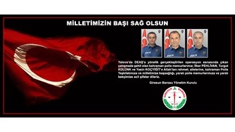 Yalova’da DEAŞ'a yönelik gerçekleştirilen operasyon esnasında çıkan çatışmada şehit olan kahraman polis memurlarımız; İlker PEHLİVAN, Turgut KÜLÜNK ve Yasin KOÇYİĞİT’e Allah’tan rahmet; ailelerine, kahraman Polis Teşkilatımıza ve milletimize başsağlığı, yaralı polis memurlarımıza ve yaralı bekçimize acil şifalar dileriz. Giresun Barosu Yönetim Kurulu