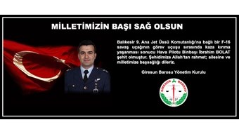 Balıkesir 9. Ana Jet Üssü Komutanlığı'na bağlı bir F-16 savaş uçağının görev uçuşu sırasında kaza kırıma yaşanması sonucu Hava Pilotu Binbaşı İbrahim BOLAT şehit olmuştur. Şehidimize Allah’tan rahmet; ailesine ve milletimize başsağlığı dileriz. Giresun Barosu Yönetim Kurulu