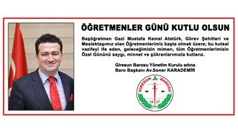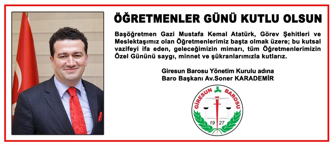 Başöğretmen Gazi Mustafa Kemal Atatürk, Görev Şehitleri ve Meslektaşımız olan Öğretmenlerimiz başta olmak üzere; bu kutsal vazifeyi ifa eden, geleceğimizin mimarı, tüm Öğretmenlerimizin Özel Gününü saygı, minnet ve şükranlarımızla kutlarız. Giresun Barosu Yönetim Kurulu adına Baro Başkanı Av.Soner KARADEMİR