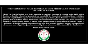 Mardin' in Nusaybin İlçesinde terör örgütü mensupları ve yandaşları tarafından Bayrağımıza yapılan hadsiz saldırıyı lanetliyoruz. Bu saldırı yalnızca Bayrağımıza değil aynı zamanda Türkiye Cumhuriyeti Devletimizin bölünmez bütünlüğüne, Ülkemizde bin yıldır birlikte yaşayan tüm halkların kardeşçe yaşama hakkına, hukuk düzenimize ve toplumsal barışımıza yapılmış alçak bir saldırıdır. Giresun Barosu olarak, binlerce Şehit ve Gazimizin canlarıyla vatan haline getirdikleri bu topraklarda bağımsızlığımızın sembolü ve herkesin kutsalı olan Bayrağımıza, Cumhuriyetimize ve İlkelerine yapılmış ve yapılacak her türlü saldırıyı düzenleyenlerin, azmettirenlerin her daim karşısında olacağımızı ve gereken cezayı almaları için sürecin sonun kadar takipçisi olacağımızı kamuoyunun bilgesine saygıyla sunarız. İlelebet Yaşasın Türkiye Cumhuriyeti. Giresun Barosu Yönetim Kurulu