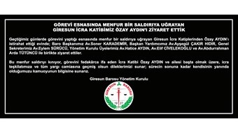 Geçtiğimiz günlerde görevini yaptığı esnasında menfur bir saldırıya uğrayan Giresun İcra Katiplerinden Özay AYDIN’ı istirahat ettiği evinde; Baro Başkanımız Av.Soner KARADEMİR, Baro Başkan Yardımcımız Av.Ayşegül ÇAKIR HIDIR, Genel Sekreterimiz Av.Eylem SÜRÜCÜ, Yönetim Kurulu Üyelerimiz Av.Hatice AYDIN, Av.Elif CİVELEKO... Devamını Oku