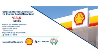 Giresun Barosu ile Shell Atlas Filo Yönetimi A.Ş. işbirliğinde, Giresun Barosu üyesi avukat ve stajyer avukat meslektaşlarımız ile baro personellerine Türkiye genelinde ki tüm Shell istasyonlarında güncel akaryakıt fiyatları üzerinden Dizel ve Benzin de %3.5, LPG de %2 indirim içeren anlaşma yapılmıştır. Kampanyad... Devamını Oku