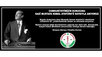Büyük önderimiz Gazi Mustafa Kemal Atatürk'ü ebediyete irtihalinin 87. yıldönümünde özlem ve minnetle anıyoruz. Bizlere emanet ettiği devrimlerinin ışığında her daim laik, demokratik, sosyal hukuk devletinin savunucusu olmaya devam edeceğiz. Giresun Barosu Yönetim Kurulu Devamını Oku
