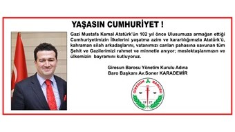 YAŞASIN CUMHURİYET ! Gazi Mustafa Kemal Atatürk’ün 102 yıl önce Ulusumuza armağan ettiği Cumhuriyetimizin İlkelerini yaşatma azim ve kararlılığımızla Atatürk’ü, kahraman silah arkadaşlarını, vatanımızı canları pahasına savunan tüm Şehit ve Gazilerimizi rahmet ve minnetle anıyor; meslektaşlarımızın ve ülkemizin ba... Devamını Oku